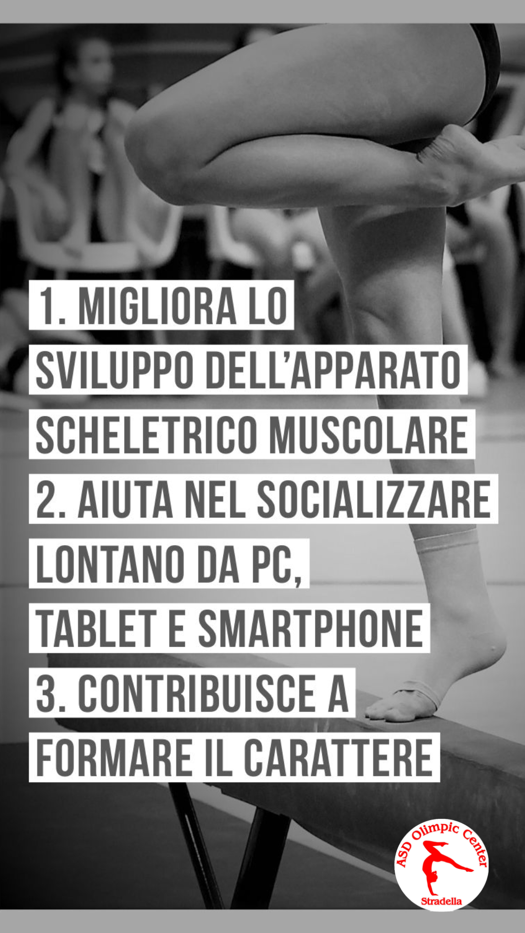 L’Olimpic Center Stradella muove i primi passi nel lontano 1979. Da quegli anni ne è passato di tempo! Ma grazie all'immenso lavoro svolto negli ultimi decenni, anche con il sostegno di meravigliosi genitori, oggi l’Olimpic Center è una solida realtà nell’Oltrepò Pavese e delle zone limitrofe. I successi agonistici sono stati molti, grazie all’impegno e alla tenacia delle Atlete, guidate dai nostri validi tecnici. In questi lunghi anni vedere salire sul podio più alto le nostre ginnaste, conquistare vari titoli nazionali in FGI, è stato un vero orgoglio, anche se interrotto purtroppo dalla pandemia.